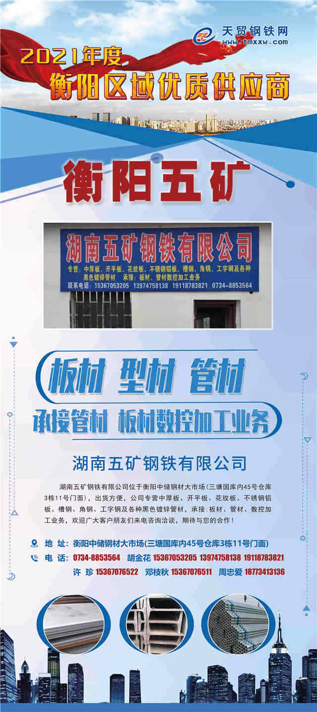 湖南五矿钢铁有限公司坐落衡阳中储钢材大市场(三塘国库内45号库房3栋11号门面),出货便利,公司专营中厚板、开平板、花纹板、不锈钢铝板、槽钢、角钢、工字钢及各种黑色镀锌管材,接受:板材、管材、数控加工事务,欢迎广阔新老客户朋友们来电咨询洽谈,等待与您的协作!
